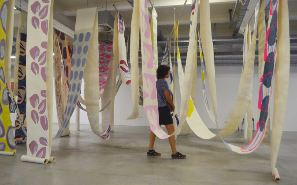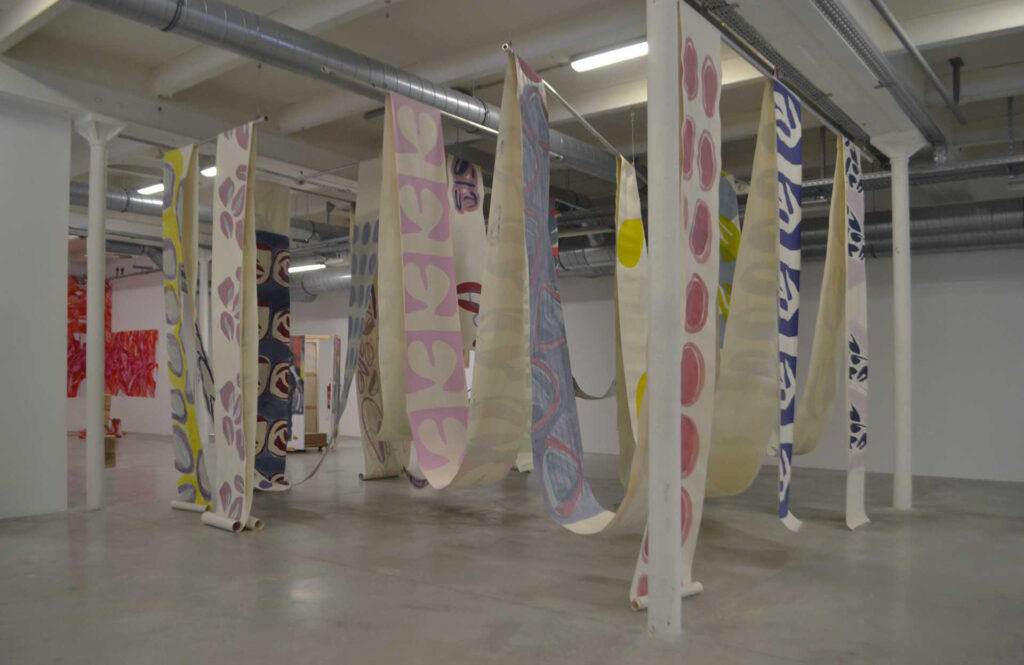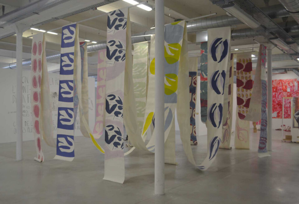 À l’instar d’un volumen sans fin, le lé de papier est utilisé comme un inventaire de motifs, comme une collection de gestes qui se déroule dans l’espace. L’analogie avec le papier peint, objet décoratif voué à habiller un espace et recouvrir les murs, est évidente. Pourtant, ici, le lé de papier fait tout sauf habiller les murs. Il est trace flottante de la peinture qui remplit l’espace. La technique de la sérigraphie utilisée permet à l’origine de reproduire un motif, de rendre une œuvre reproductible. Or ici, la sérigraphie est utilisée comme un geste de peinture supplémentaire. L’ambiguïté des motifs obtenus, de par leur nature unique et/ou reproductible, questionne et perturbe le regard.