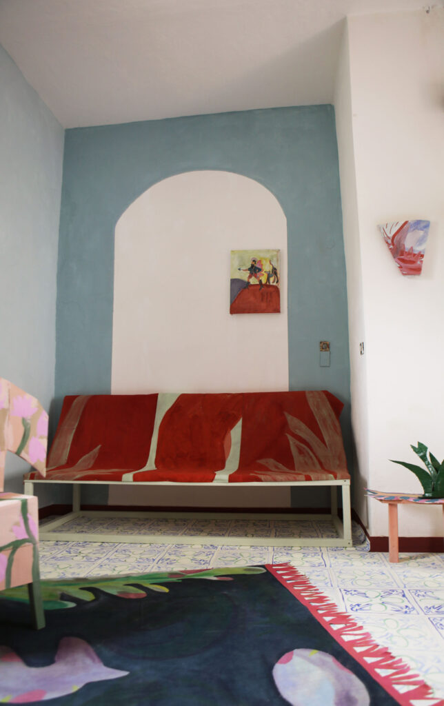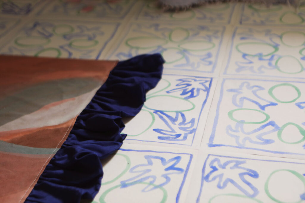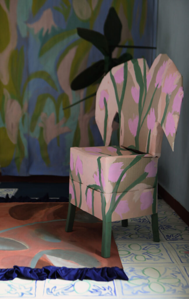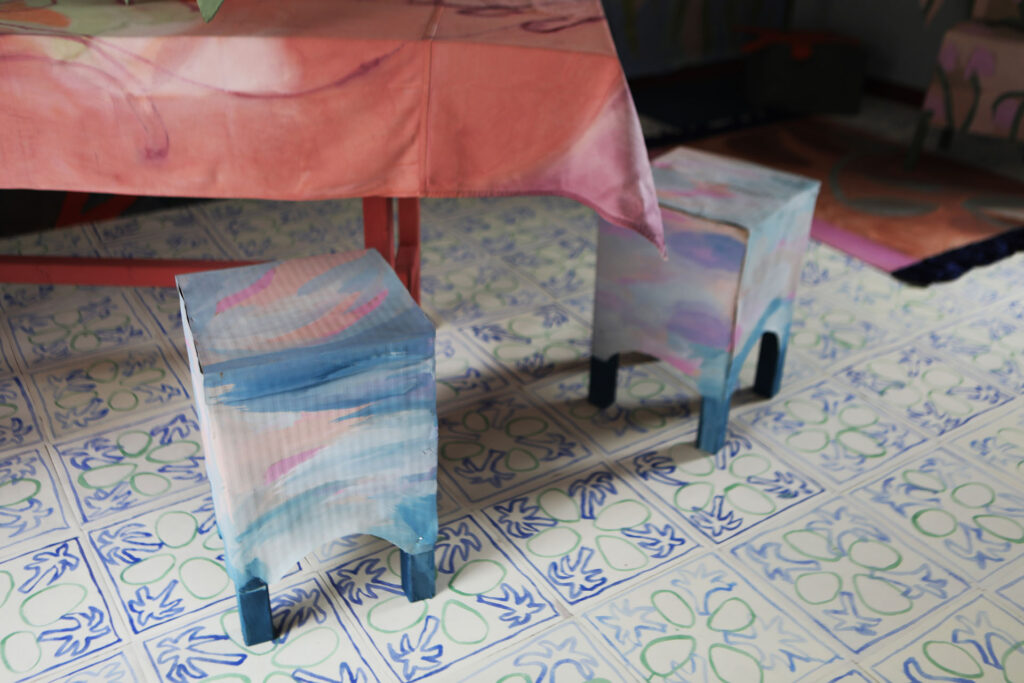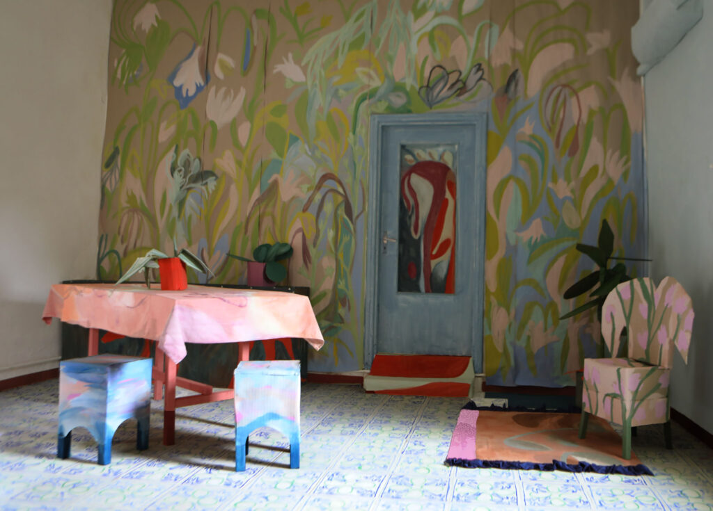 Casa Nuvola a été créée lors d’une résidence d’un mois avec l’Institut Français d’Italie à Grottole (IT), un petit village près de Matera. Le centre du village est presque déserté. Le studio où nous avons travaillé était une maison abandonnée, abimée par le temps, restant clairement reconnaissable comme un foyer, avec des meubles oubliés et des objets décoratifs. À travers les premières impulsions de rangement et de nettoyage, nous avons réalisé comment nous essayions de nous l’approprier et comment tout semblait se résumer à une performance gestuelle pour emménager dans celle ci. Suivant cette idée, nous sommes passées à la conception de notre maison de rêve et avons joué de nous même en tant qu’artistes à la campagne. Nous avons utilisé des clichés, peint des souvenirs et des observations du village, nous avons construit en papier et tissus des meubles fragiles et invité les habitants à une pendaison de crémaillère fictive.